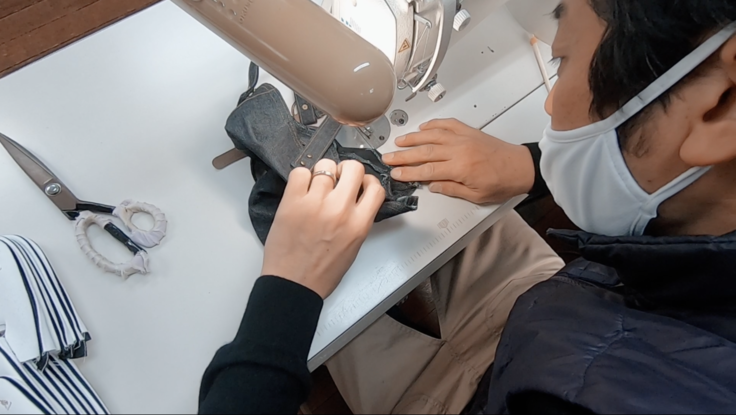 昨年4月の緊急事態宣言時に、帽子職人の池上氏と宮川徳三郎がデニムの立体マスクを作ったことが、このベストマスクの製作をするきっかけでした。当初はマスク不足により早急にマスクを作る必要がありました。そのため、短期間で打ち合わせを繰り返し、国産デニムの立体マスクを仕上げたのです。