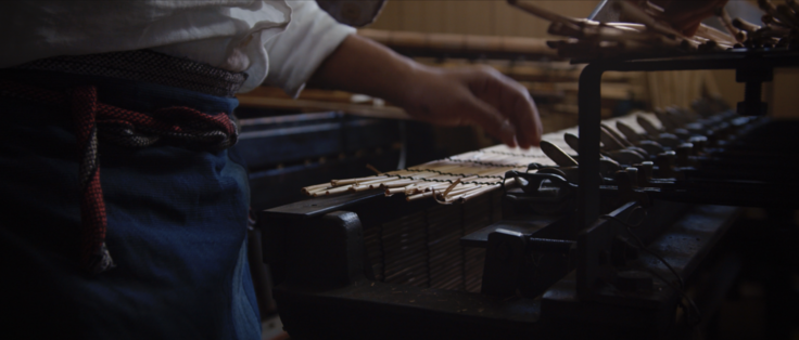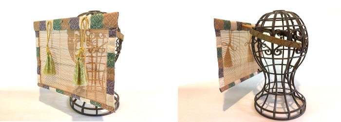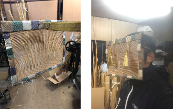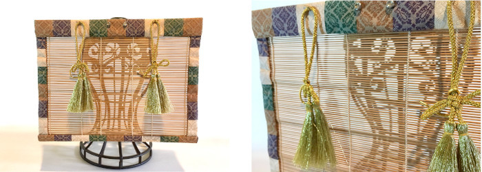 御簾の部分は幅20センチほどで小型ではありますが、本来の御簾の製作と変わらない技法が施され、細部に至るまで職人のこだわりが散りばめられてます。簾の素材となる竹ひごや房、そして縁の裂地に至るまで、従来の御簾に使用する材料を使用し製作しております。
