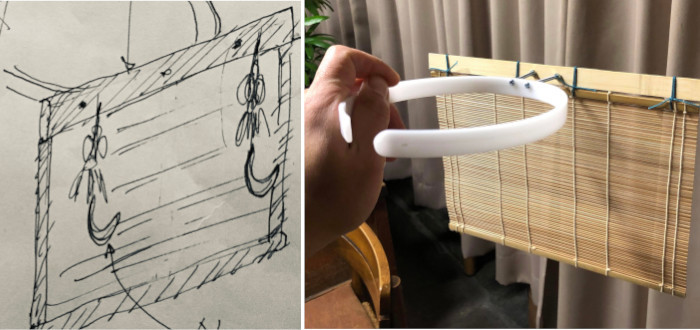 今回のこの置き場所は「置く」のではなく「掛ける」ようにし、マグネットフックの製作を試みました。置くことは接地面が大きくなり衛生面は良くないですが、掛けることで少しは軽減できると考えました。