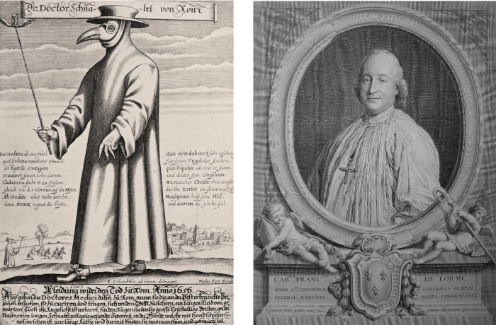 (左)ペスト医師の格好と(右)ペストマスク を考案した医師シャルル・ド・ロルム