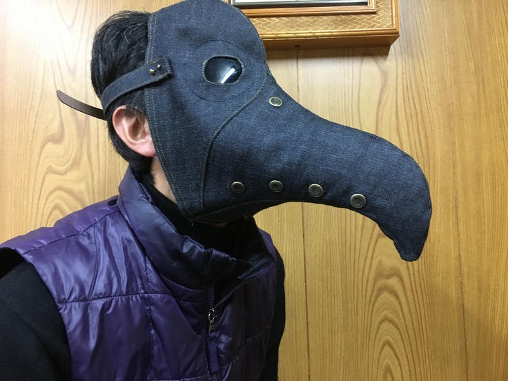 その後、デニムマスクを発展させてフェイスシールドが作れないか模索しました。万が一の例え話として、さらにこの世の中がコロナにより悪化した時に、正直ガスマスク級のものが必要になるんじゃないかと言う話になったのです。リサーチしたところペストマスクと言う奇妙なマスクに出会いました。
