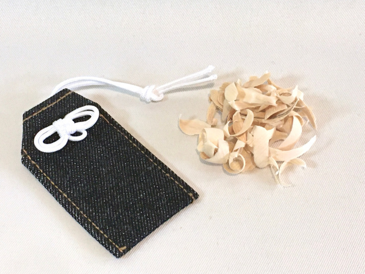国産デニムのお守りと能面製作時に削り出されたご祈祷を受けた木片