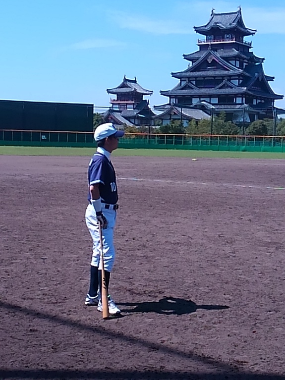 (城のそばの球場で、試合開始を待つ長尾監督)