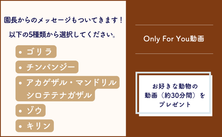 お好きな動物のとっておきの動画(約30分間)をプレゼントします。園長からのメッセージもついてきます!