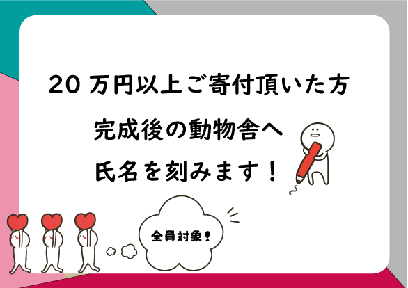 また、1口20万円以上ご寄付いただいた方には、完成後の動物舎に氏名を銘板に記載いたします。こちらは皆様対象です!