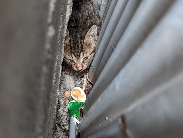 現場は京都市内の住宅地。子猫はブロック塀とトタンの間、ほんの数センチの隙間に挟まり、もがきながら必死に鳴いていました。自力で出ることはもちろん、人の手も届かず、時間だけが過ぎていきました。