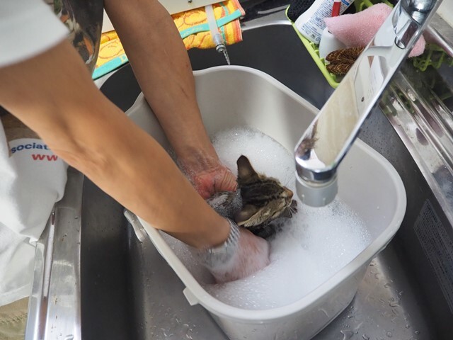 すぐにTNRサポートセンターで駆虫処置を受け、翌日にはシャンプーをしてもらい、清潔な状態でシェルターへ移動しました。