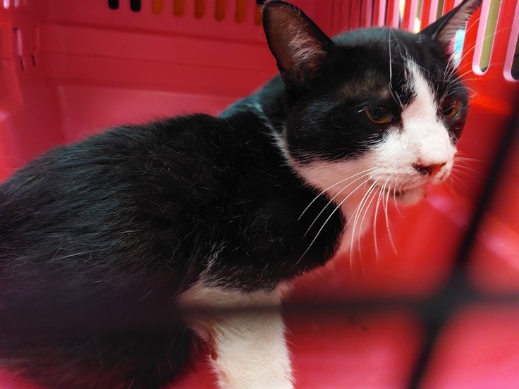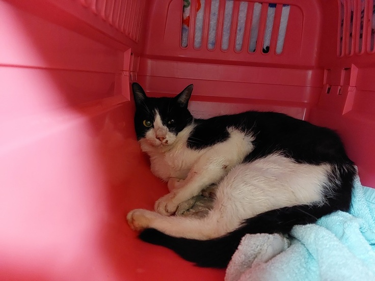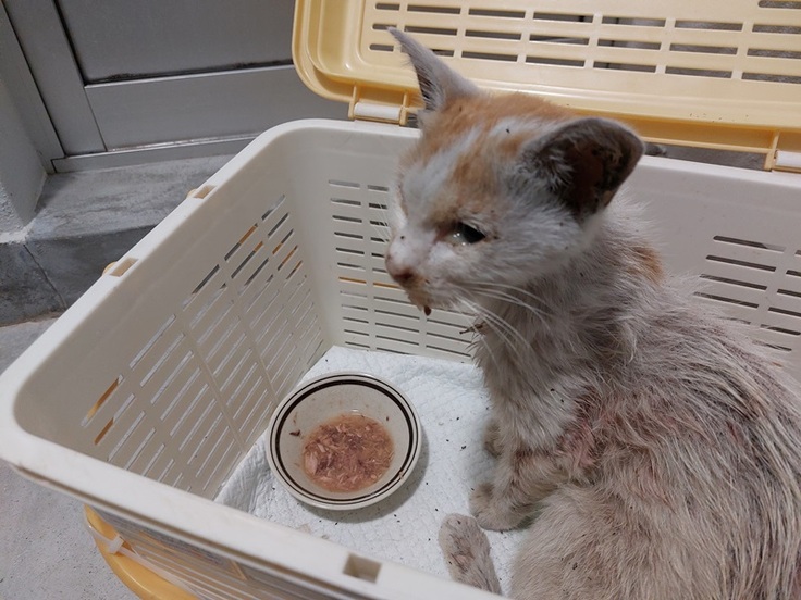 市内で行き倒れていた猫を保護し、応急処置を行いました。
