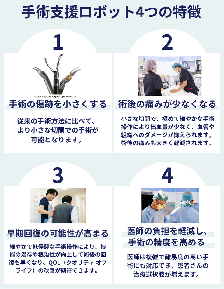 ロボット支援手術は、傷跡が小さく、手術後の痛みも少なく、合併症のリスクも低減できる患者さんの体にやさしい手術(低侵襲)です。また、医師の手では届かない術野へのアプローチができ、繊細かつ精緻なオペレーションが可能になります。