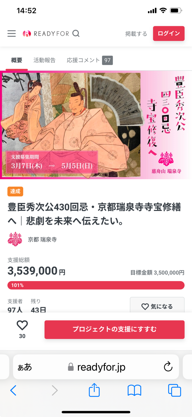 当初の目標額を達成しましたが、終了設定日の5月5日までクラウドファンディングを続けていこうと思います。ここまでで皆様からいただいたご支援で寺宝の修繕を行い、秀次公と御一族のことをより多くの人たちと未来へ伝えていくための資金とさせていただこうと思います。引き続き、ご支援のほど、よろしくお願い申し上げます。