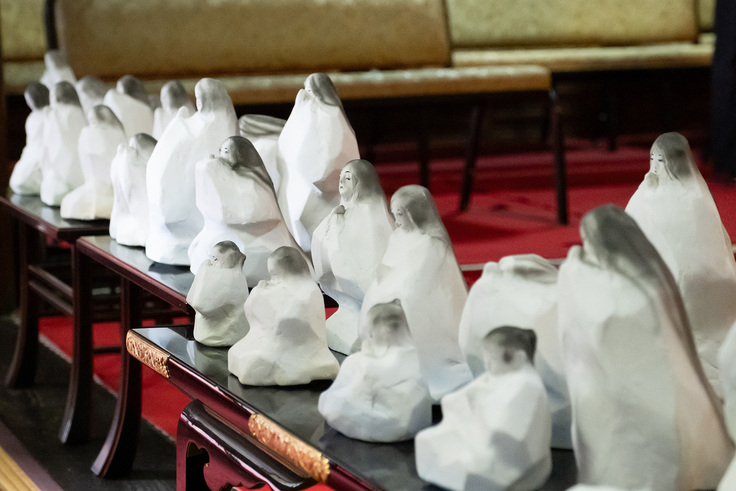 ただ、語られる一人一人の女性の毅然とした佇まいと、辞世の句に詠まれる迷いの無さ(瑞泉寺に伝わる辞世の句を安田さんが朗々と読み上げ、現代語訳を女性が語ります)に、凛とした潔さが感じられ残虐な感じはしません。また処刑される女性たちは人形で表現され、それを先ほどの側室たちの霊が一人ずつ運んで観客の前に並べていくことで演じられていました。人形たちは白い素材で作られ最小限の彩色を施されたとても清楚な作りで生々しさは感じられず、それらの演出が彼女たちを襲った理不尽な運命の惨さ悲しさを増幅していっそうの涙を誘いました。