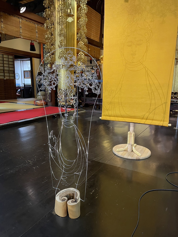 そのシーンに電子音楽の美しい調べと、声楽の声、さらには僧侶の読経が重なっていきます。さまざまな音楽と音が渾然一体となっていき、これがいつ果てるともなく続いて、やがて宗教的な荘厳さが生み出されていきます。女性たちは次々に斬られていきますが、「第二十八番於国の前」「第二十九番於須儀の前」という呼び出しも何か卒業式のようで、極楽浄土へと旅立っていくような、新しい世界へと浄化されていくような感動を覚えました。これは法要だ、そう思いました。そして全てが終わった時、仏師の作った針金仏が舞台にぽつんと残されていました。供養が成ったと感じました。