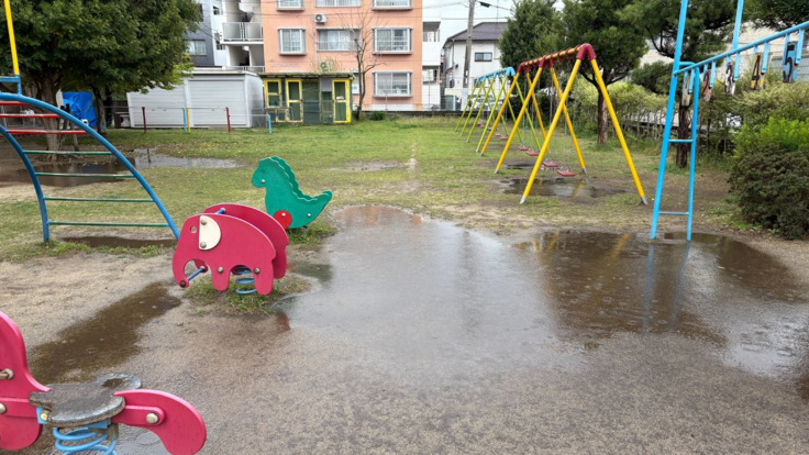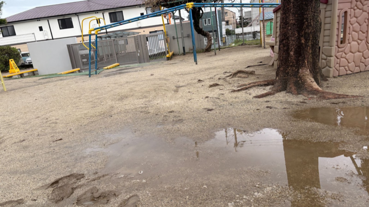 また、昨今の異常な暑さのため、屋外での遊びが減少しており、自然とのふれあいも不足しています。隣接する宅地との高低差によって、雨が降ると水はけが悪いため、すぐに水たまりができてしまいます。