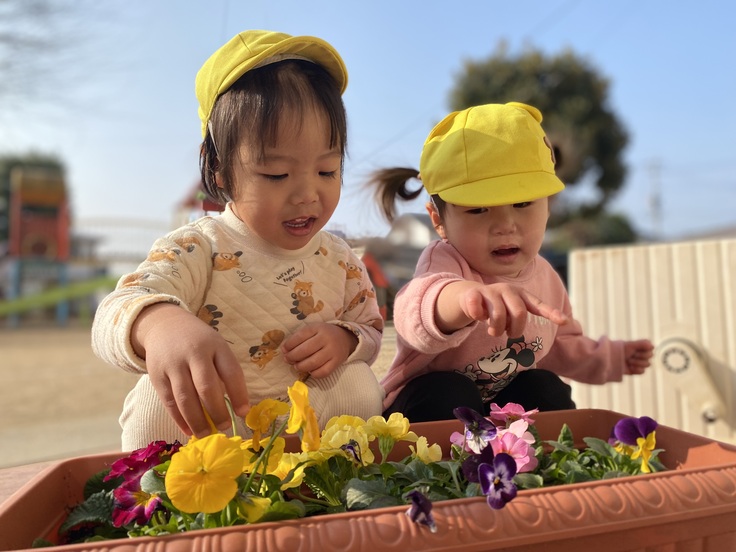 「お庭にお花が咲いてます」と歌い出す九州音楽京塚幼稚園の園歌。天気晴朗、お庭にはいつも子どもたちのキラキラとした笑顔と元気な声があふれています。