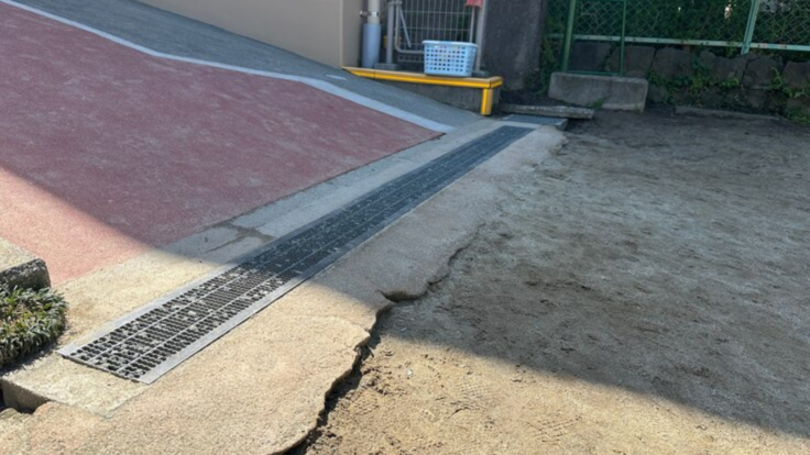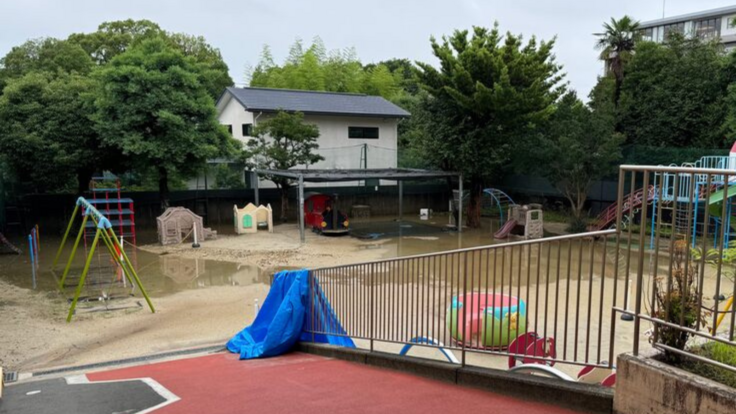 京塚の園では、激しい雨の日は園庭が水浸しになり、子どもや保護者の往来が大変です。水前寺の園では、雨天時は園庭がたびたび冠水してプールのようになり、雨が上がっても翌日は園庭遊びができない状況です。