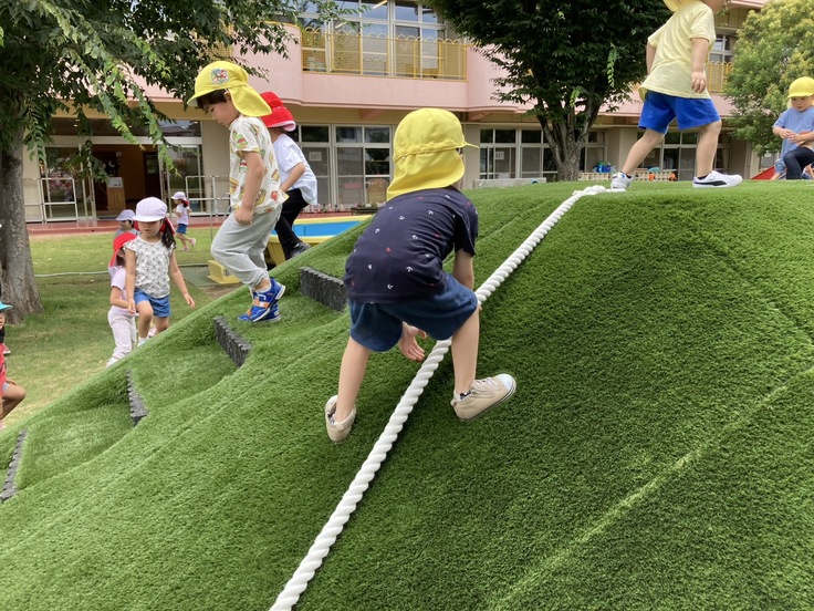 九州音楽京塚幼稚園では芝生が貼られた緑のきれいな園庭でのびのびと遊んでいます。