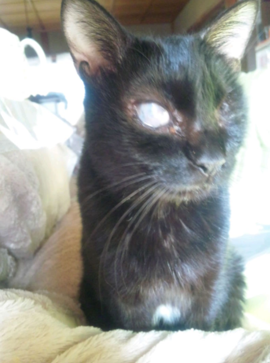 獣医さんからは片方の眼球は生まれつき無く、もう片方は、どこかにぶつけて脱臼、角膜に傷ついてしまい見えない。全盲の猫さんであると知らされました。