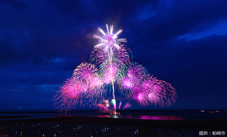 日本海を舞台とした広大な打ち上げ範囲が最大の特徴!約16000発の花火が壮大なスケールで打ち上げられます。同じ新潟県内の「長岡まつり大花火大会」「片貝まつり浅原神社秋季例大祭奉納大煙火」とともに越後三大花火大会の一つに数えられ、そのロケーションから「海の柏崎」とも呼ばれます。