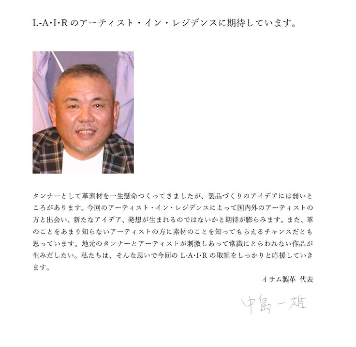 L-AIRは皮革を通じた芸術や表現が、人と人とのつながりや歴史背景など、あらゆるものを超えた人間同士のより深いつながり、文化の継承を実践する目的で設立いたしました。国内外からアーティストを兵庫県姫路市のレジデンスに招致、滞在中の活動を支援し皮革文化の新たな表現手段の開拓と地域創生を共に取り組む事業を企画しています。