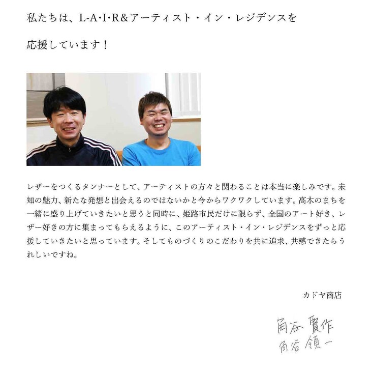 今回、L-A・I・Rがクラウドファンディングを利用したいと考えたのは、多くの人に姫路レザーを知ってほしい、できるだけ多くの人に参加していただいてアーティストを応援したい、アーティスト・イン・レジデンスを成功させたいとの思いからの挑戦です。