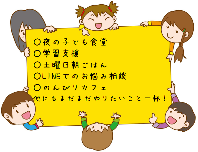 食事や学習支援だけでなく、ほっとできる居場所の確保や、相談できるお兄ちゃんお姉ちゃん等の存在等、もっともっと必要な支援があります。