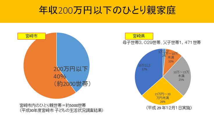 「宮崎市子どもの生活実態状況調査(平成29年度)」によると、約5000世帯がひとり親であり、40%が相対的貧困(平均年収の2分の1)世帯であるとの調査結果が出てきます。