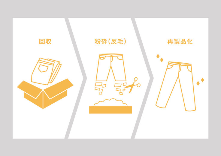 リサイクルジーンズとは、不要になったデニム製品を工場で粉砕して繊維状に戻し、それを使って再び糸をつくり、製品にしたものです。