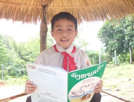 ラオス事務所が出版した「カメと白鳥」の絵本を読んでくれている男の子が