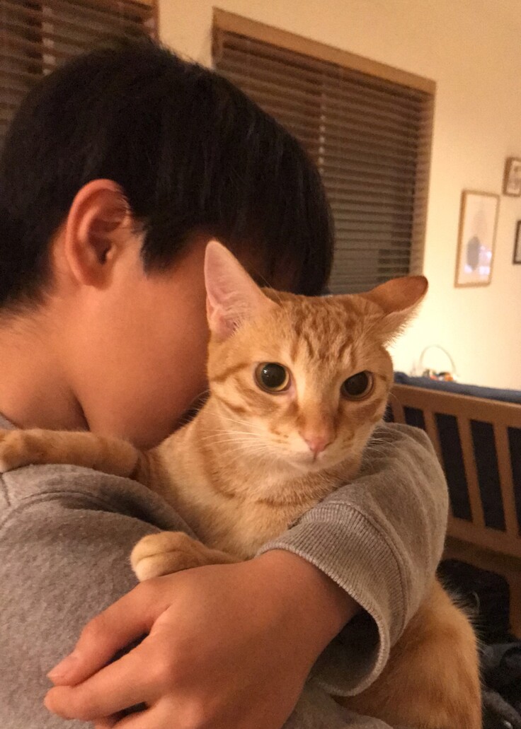 次男はラテが大好き。ラテ、愛が重すぎてちょっと困り顔^^