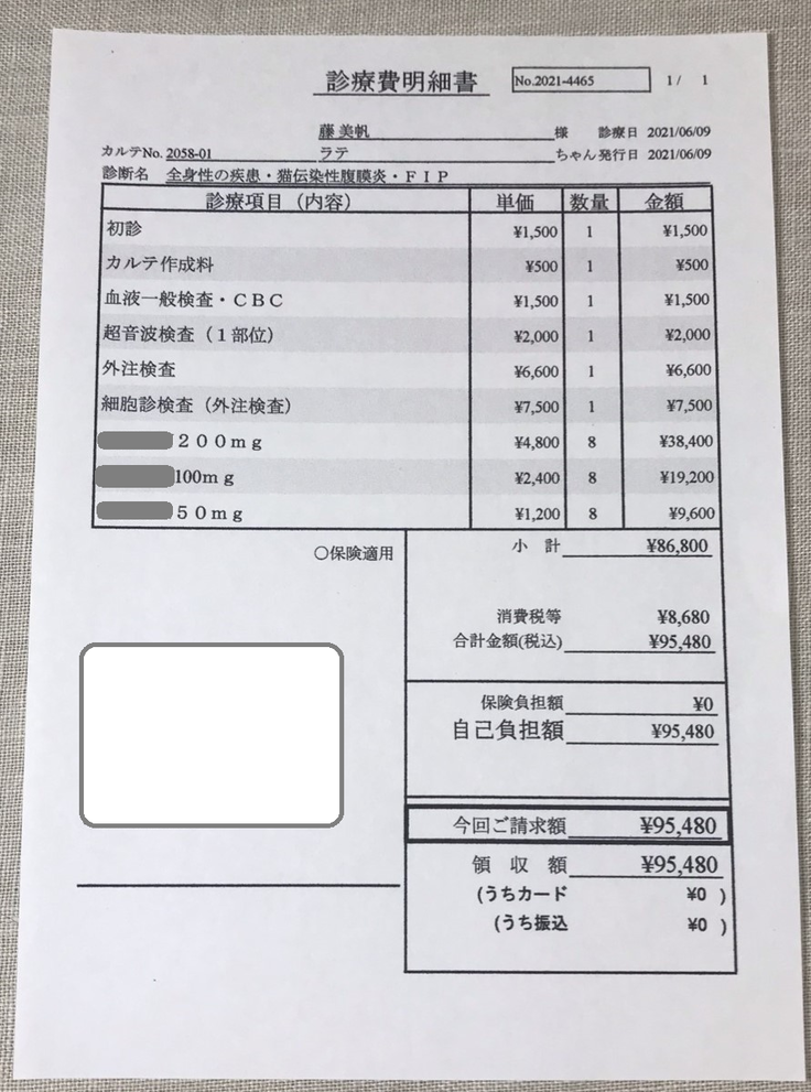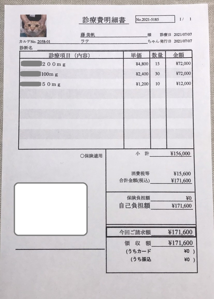 経過が良くなって体重が増えればさらに薬の量も増えることになります。ラテは元々3.7kgはあったのでそこまで体重が増加することを考慮すると薬代だけでおよそ100万円くらいになります。その他の診察・検査代等も含めると少なくても110万円以上かかる計算になります。