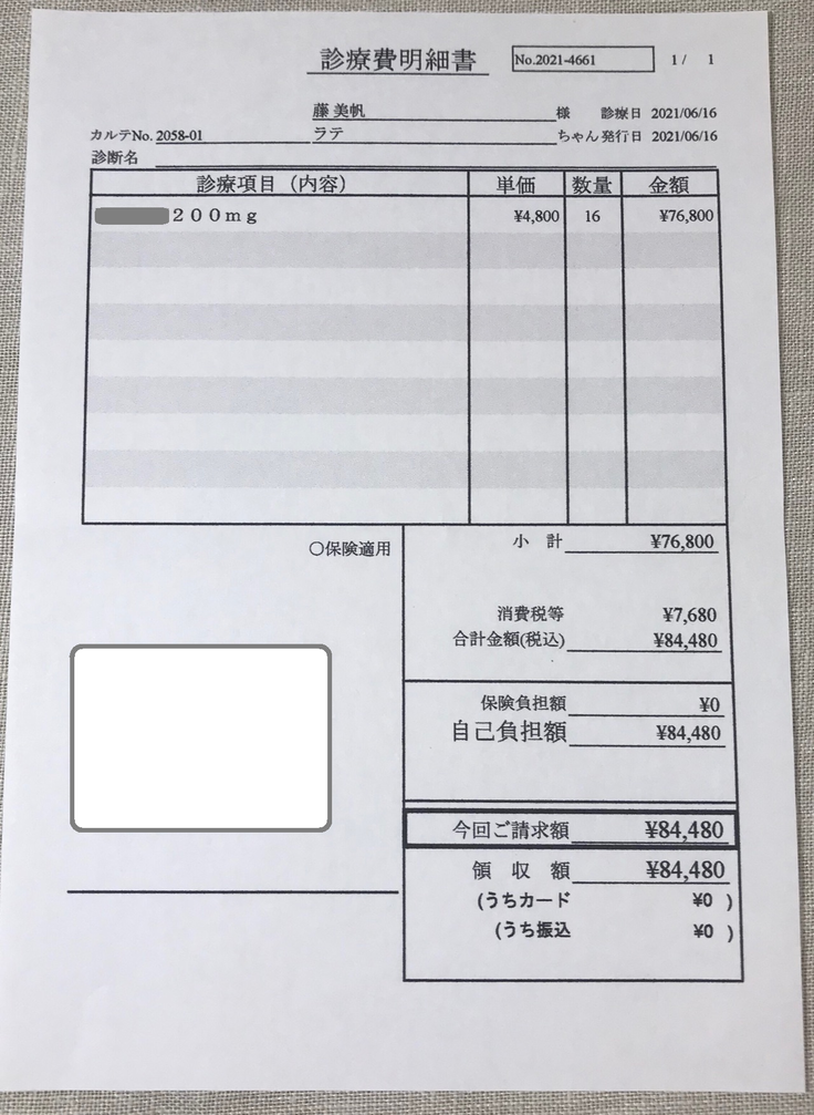 6月7日〜7月7日の治療費合計 593,055円(そのうち薬代は46日分で488,400円)