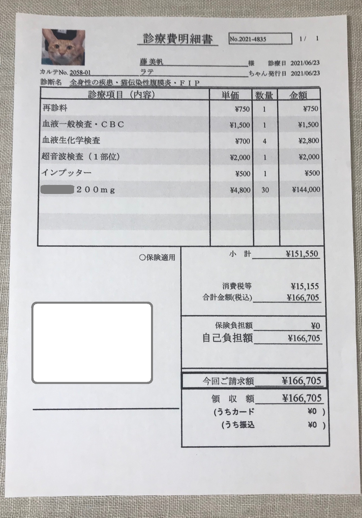FIP(猫伝染性腹膜炎)の治療のため、未承認薬の投薬(84日間)