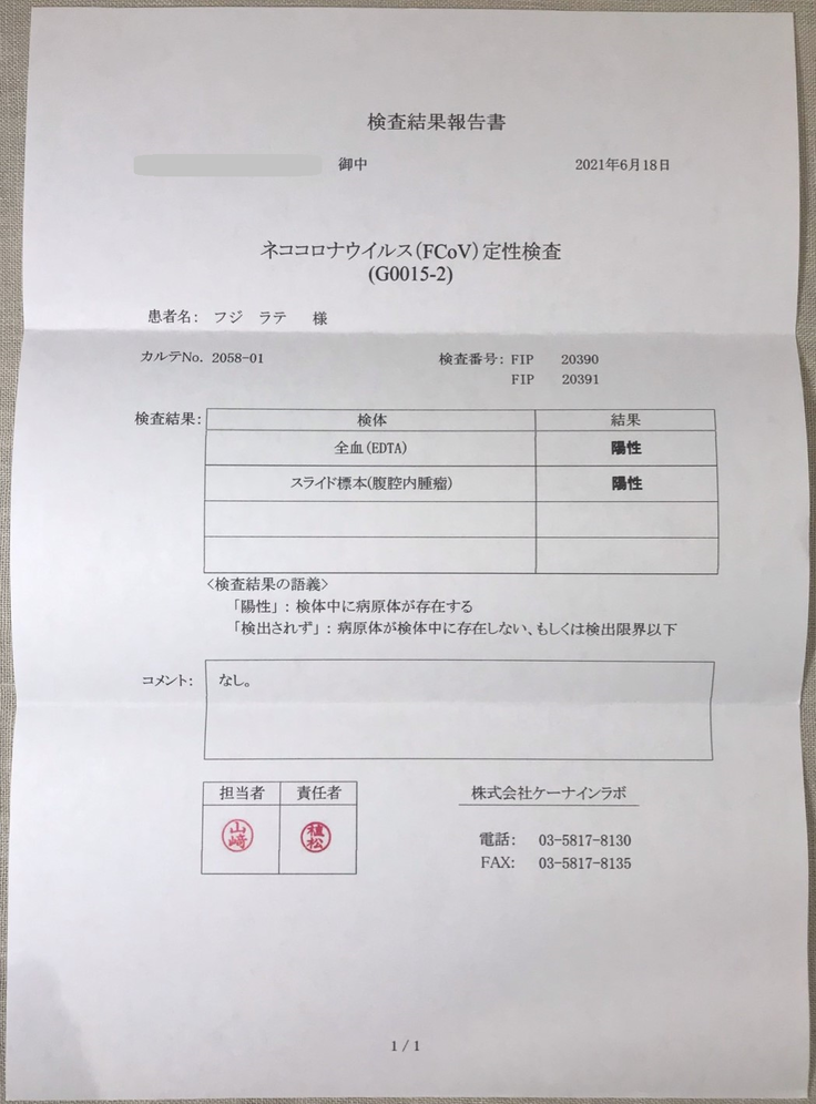 電話で説明してあったのですぐに検査してもらい、そこでの診断もやはりFIPで間違いないだろうと。でも先生は「大丈夫。薬で良くなりますよ。」とはっきり笑顔で仰ってくれて。。