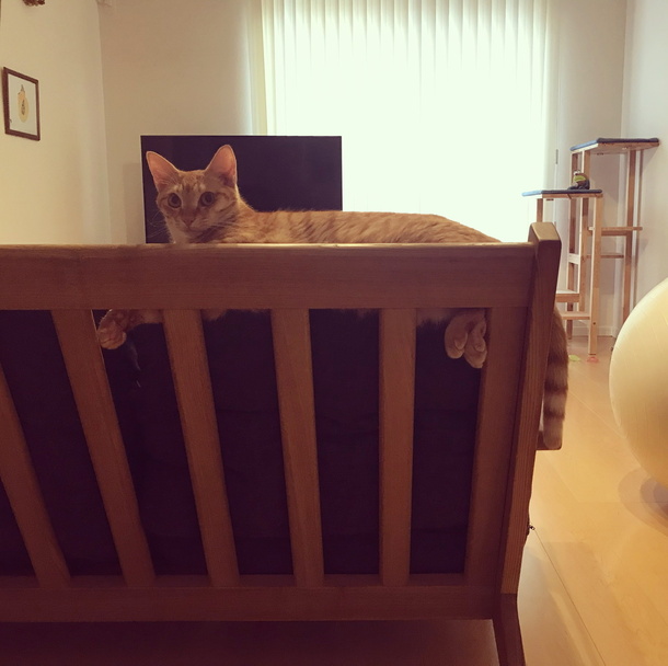 写真はソファのへりにハマってなんだか可笑しな感じで寛いでいたラテです。
