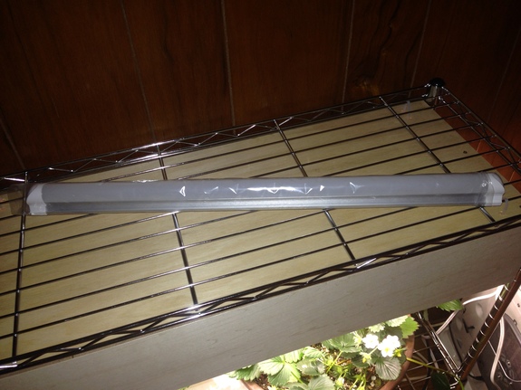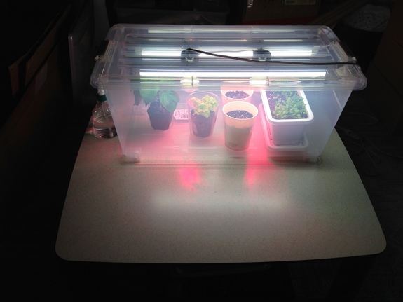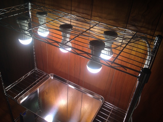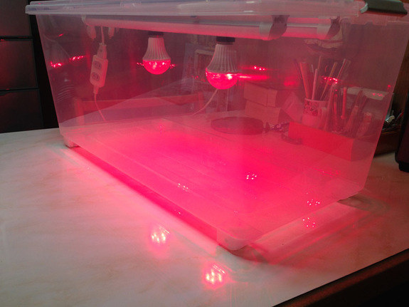 お古のキッチンワゴンに、収納ケースの蓋に取り付けた光源をセットし、栽培スタートです。ただしここで、赤色の電球ではさすがに玄関ホールで使用するのは気がとがめたため、電照菊用に私が開発した、赤色と白色のLEDチップを組み合わせた電球に、赤色の電球から取り替えました。