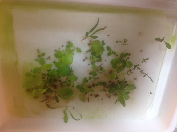 この写真は、不織布(吸水性が強い某メーカーの農業資材です)を使用して、種をただまいただけの状態での栽培です。水耕栽培で、溶液は不織布を伝わり種に届きます。