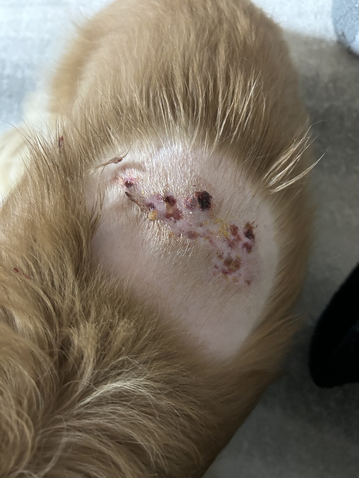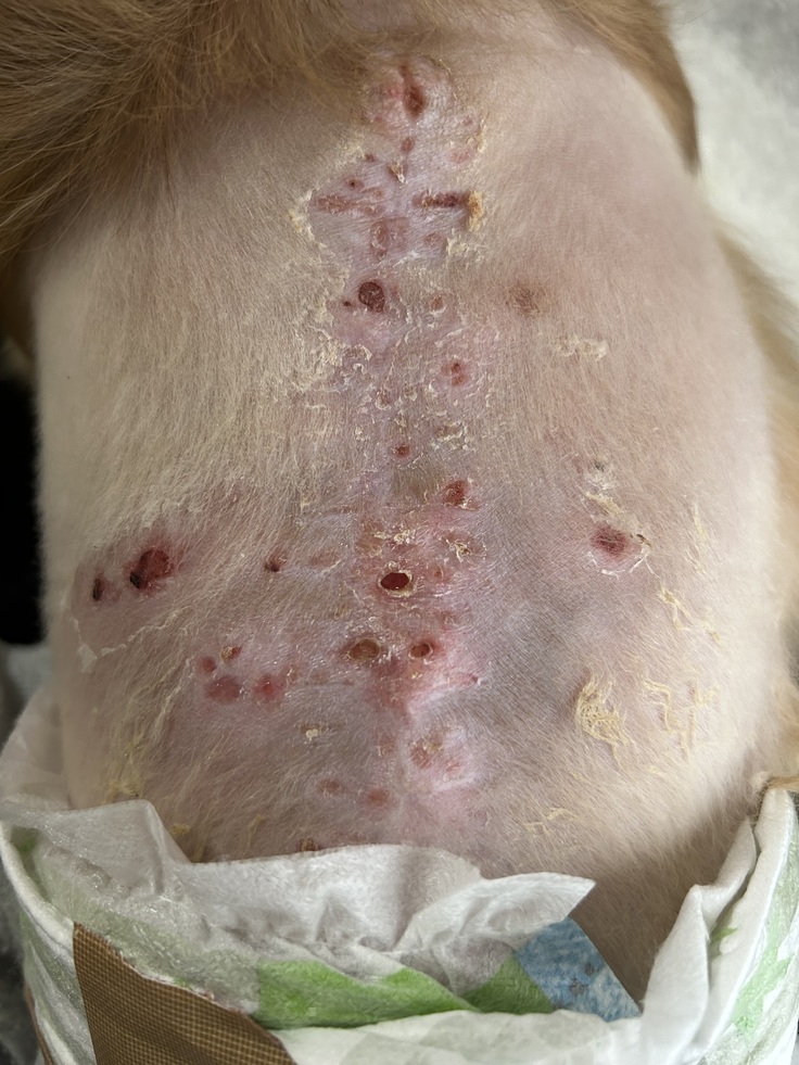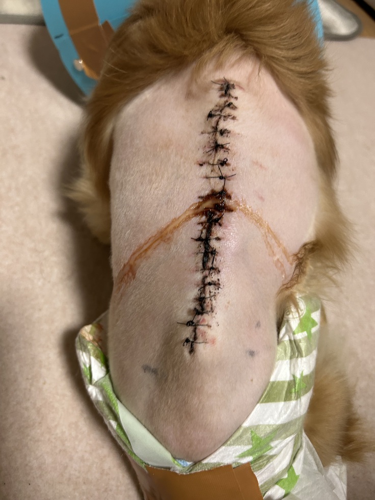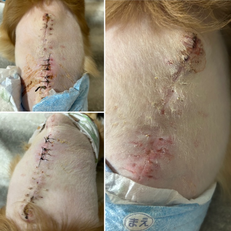 ステロイドや抗生剤💊で管理、こまめに通院し、よくなってきた所から徐々に抜糸していき、最終的に2月末に抜糸完了。