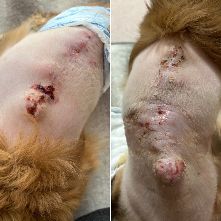 ステロイドの影響で皮膚が薄くなったせいか、針穴ぐらいの小さな穴だったのが引っ張られて3月末には穴が広がり、骨が見えるように…。