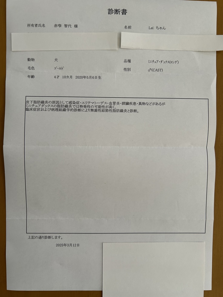 また、ヘルニアによって下半身麻痺になってしまった今、そのリハビリに、脂肪織炎が少しでも落ち着いてくれば、リハビリの病院にも通いたいと考えております。