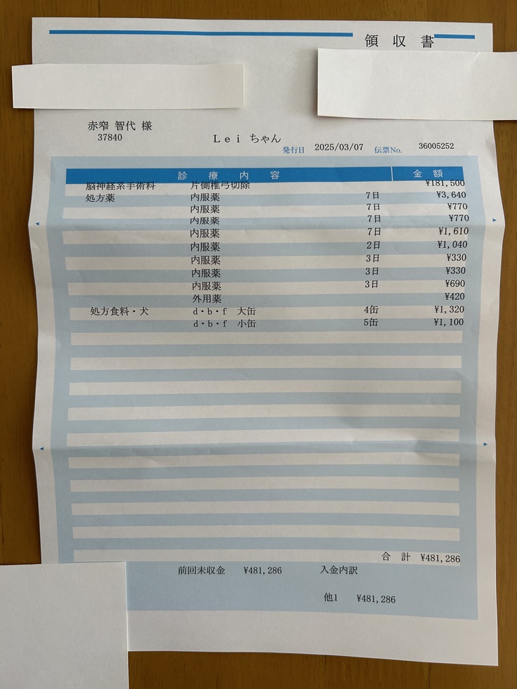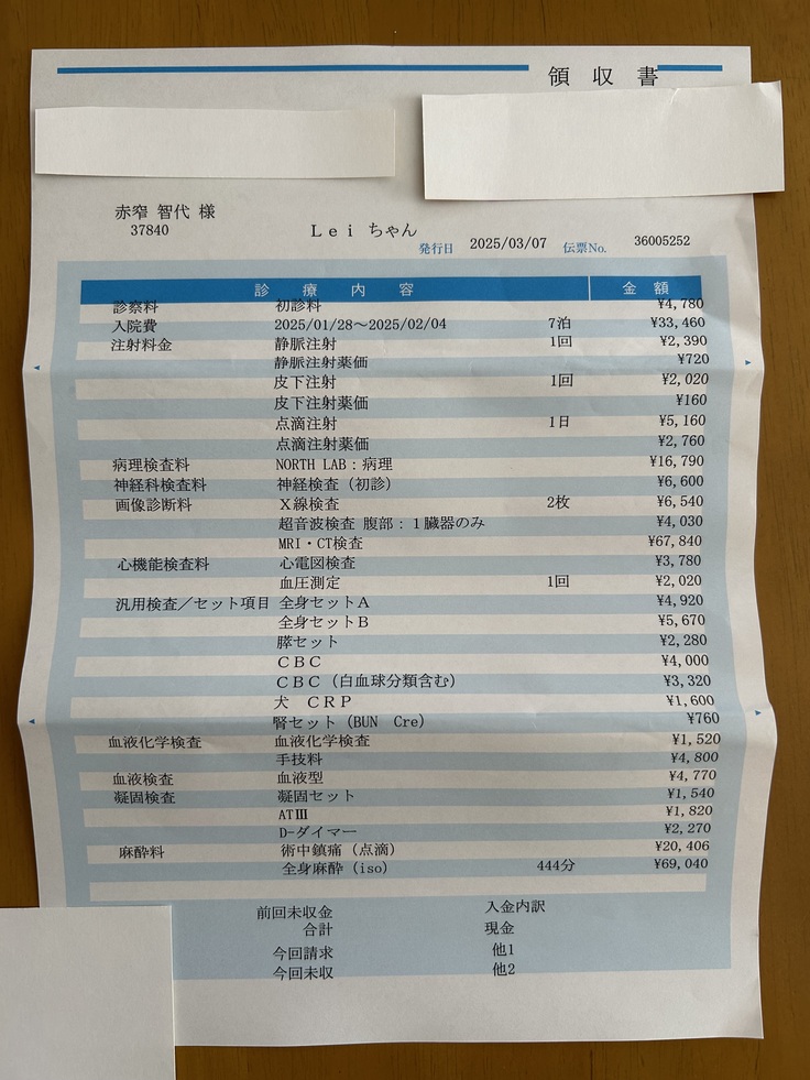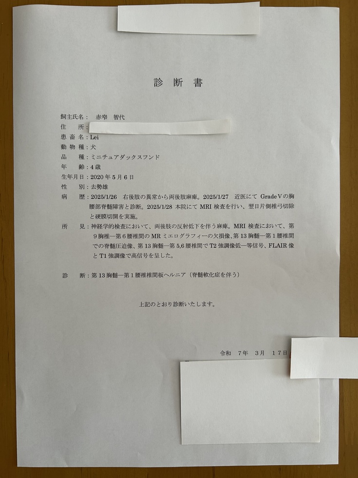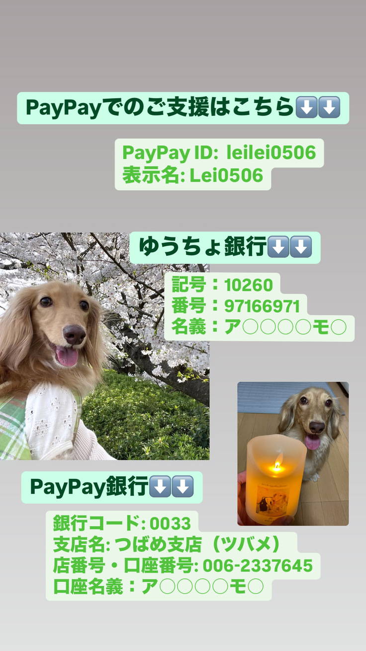 そして先日行ったヘルニア・進行性脊髄軟化症の検査費や手術費、入院費に充てさせて頂きます。