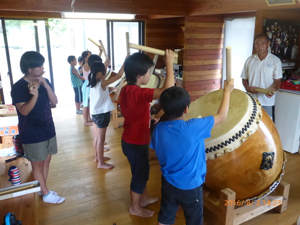 水泳教室に来ている子供たちの中には、水泳のあと『夏休み塾』のもう一つの教室「気仙けんか七夕太鼓教室」に参加する子もいます。