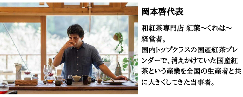 岡本代表は国産紅茶ブレンダーで、2001年から佐賀県佐賀市にて日本で数少ない国産紅茶の専門店とカフェ(和紅茶専門店「紅葉~くれは~」)を経営しています。その傍ら、ティーテイスターとして国産紅茶のコンテストの審査員を務めたり、「和紅茶の本」を出版したりしています。また、国産紅茶ブレンダーとして数多くの商品開発に携わっており、監修した九州紅茶梅酒「CREHA」は全国梅酒品評会2016でブレンド部門1位、金賞を受賞しました。