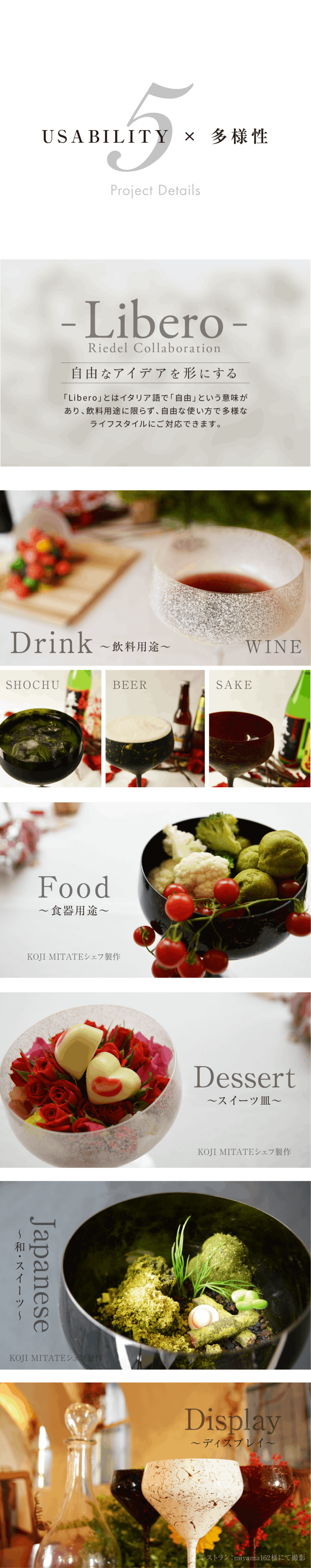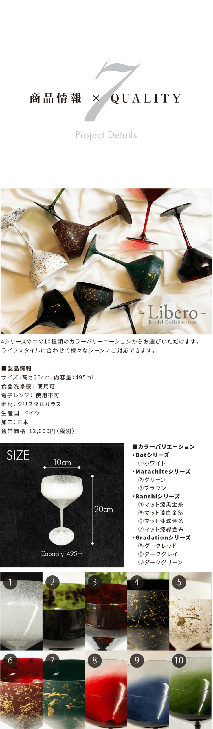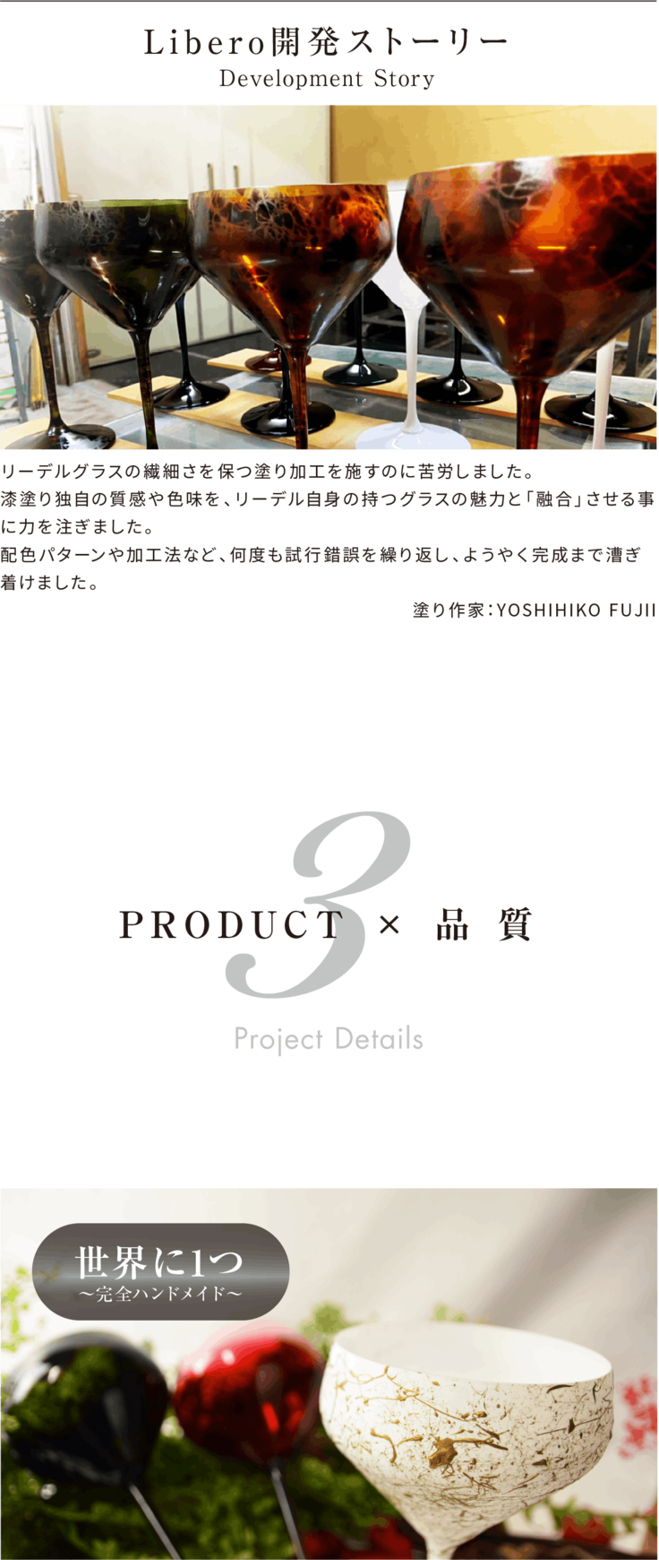 今回のプロジェクトは、リーデルの日本酒グラスを漆塗り加工した「Libero」というグラスで、「自由」という意味が含まれています。日本酒のみならず、ワイングラスや食器、さらにインテリアまで、様々なライフスタイルの可能性を幅広く広げてくれると信じております。