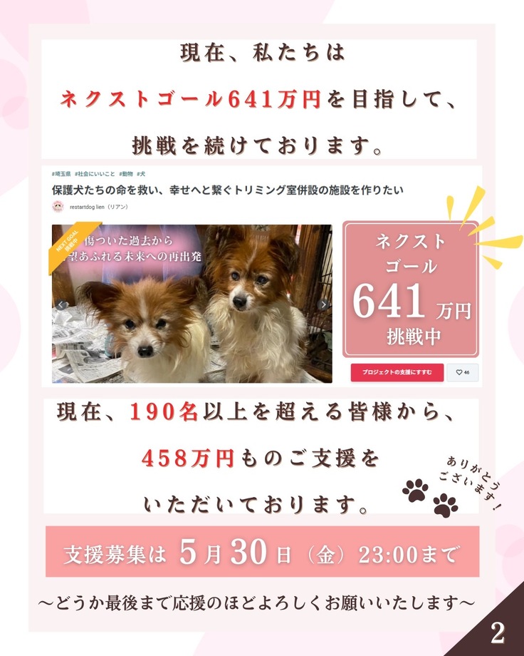 READYFORで挑戦中のプロジェクト「保護犬たちの命を救い、幸せへと繋ぐトリミング室併設の施設を作りたい」ですが、おかげさまで公開から約2週間で第一目標である385万円の目標金額を無事達成することができました。