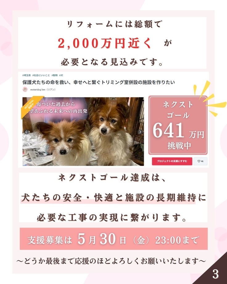 ネクストゴール達成が叶えば、防音工事(二重窓を新しく付け替えると高くなるため現場の窓の内側に内窓を設置)、外壁の工事、雨漏り対策、水回り工事の一部など、今後安心して施設を長く使うことができるようなリノベーションを実現することができ、犬たちに寄り添った保護施設として、保護直後の衛生管理やトレーニング、譲渡活動が円滑になり、保護の幅がさらに広がります。