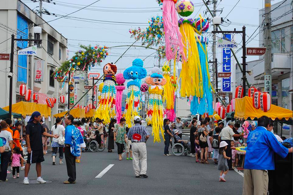 この写真は、みなと祭りと同日に行われてた七夕まつりの風景です。
