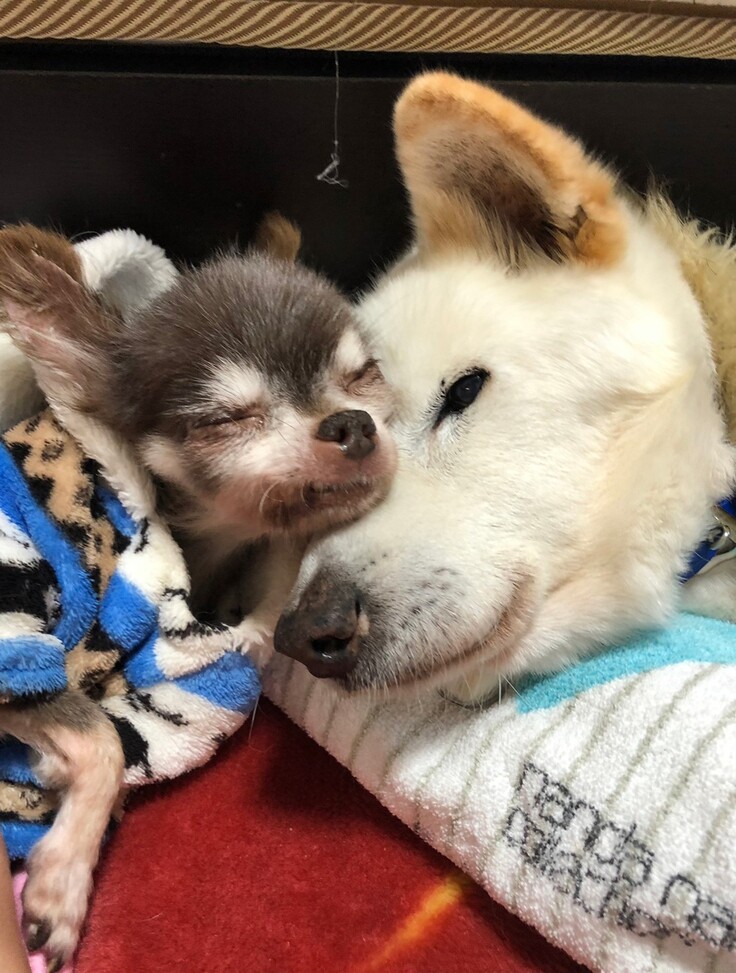 現在我が家には紬という名の犬がいます。にことの出逢いがあり、そしてたくさんの方がご縁をつむいでくれたおかげで助かった命です。心配していた猫たちとも、特に下半身不随の仔と一番仲良く、寒い日はストーブ前で一緒に暖をとっています。家族が増えて毎日がドタバタではありますが、この仔たちの存在にとても助けられ幸せな日々を過ごしています。