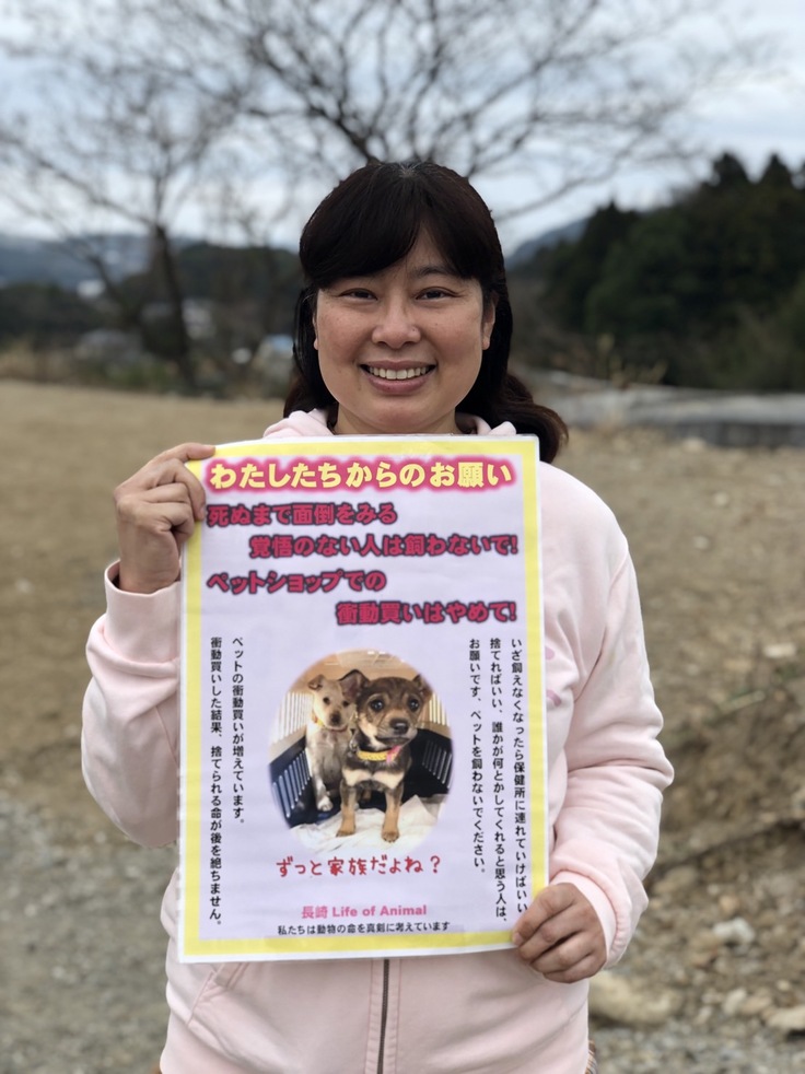 長崎市を拠点として、人間の身勝手で捨てられる動物を減らすために、毎月街頭に立ち、飼い主のモラル向上のための啓蒙活動をしたり、行き場を失った犬たちの現状を多くの人に知ってもらうため、そして「安易にペットを迎えないで」と訴え続けていたり、センターに収容されている犬たちの精神面や健康面のケアー、里親探しと、その後のフォロー、個人飼育困難や、多頭飼育崩壊の壮絶な現場へも介入し、犬を保護するだけではなく、飼い主側の気持ちにも寄り添い耳を傾け、解決策を探していく。