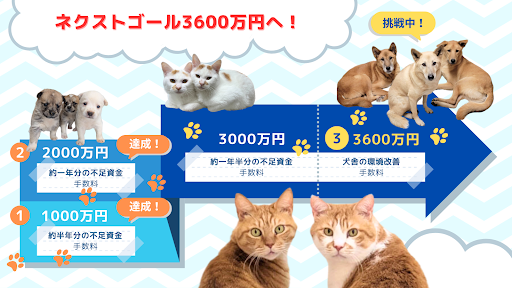 第三目標は、追加半年分の運営費に加え、これまで取り組みたくても取り組むことができていなかった「犬舎の環境改善」も含めて、3,600万円の目標を掲げて挑戦いたします。