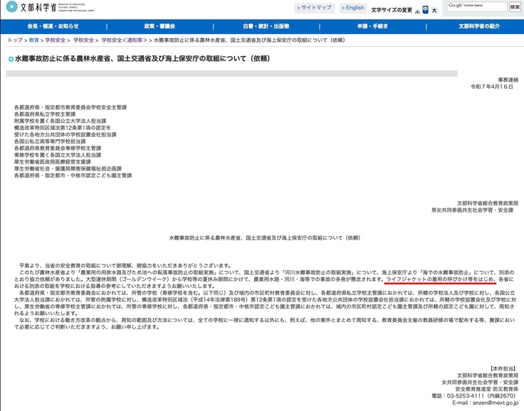毎年、ゴールデンウイーク前に、文部科学省さんから通知されている「水難事故防止」に係る通知の中に、